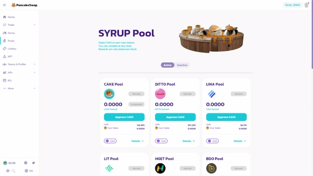 CAKE를 획득한 다음에는 이를 SYRUP 풀에 스테이킹할 수 있습니다. 풀 탭으로 이동하면, CAKE를 스테이킹할 수 있는 풀들을 볼 수 있습니다.
