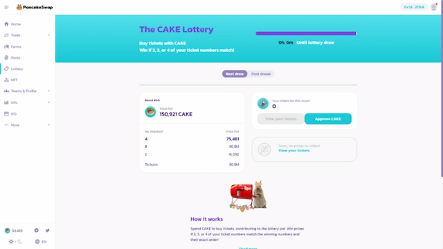 각 복권 세션은 6시간이 소요됩니다. 하나의 티켓은 10 CAKE이며, 이를 통해 1에서 14 사이의 임의의 4자리 숫자 조합을 얻을 수 있습니다. 예를 들면, 12-8-4-3입니다. 당첨금(전체 복권 풀의 50%)을 받으려면, 당첨 티켓과 4자리 숫자와 순서가 모두 동일해야 합니다.